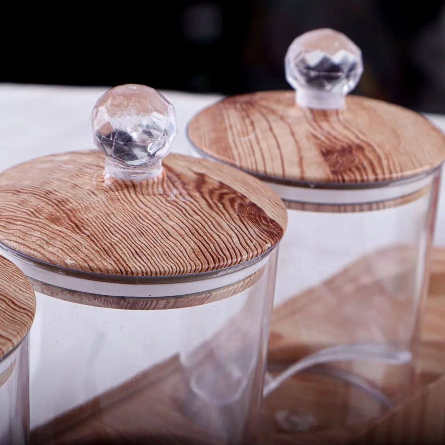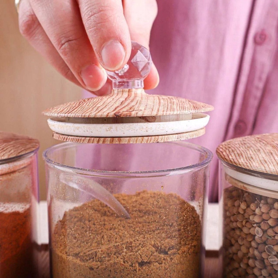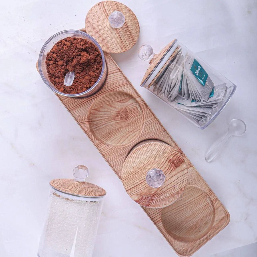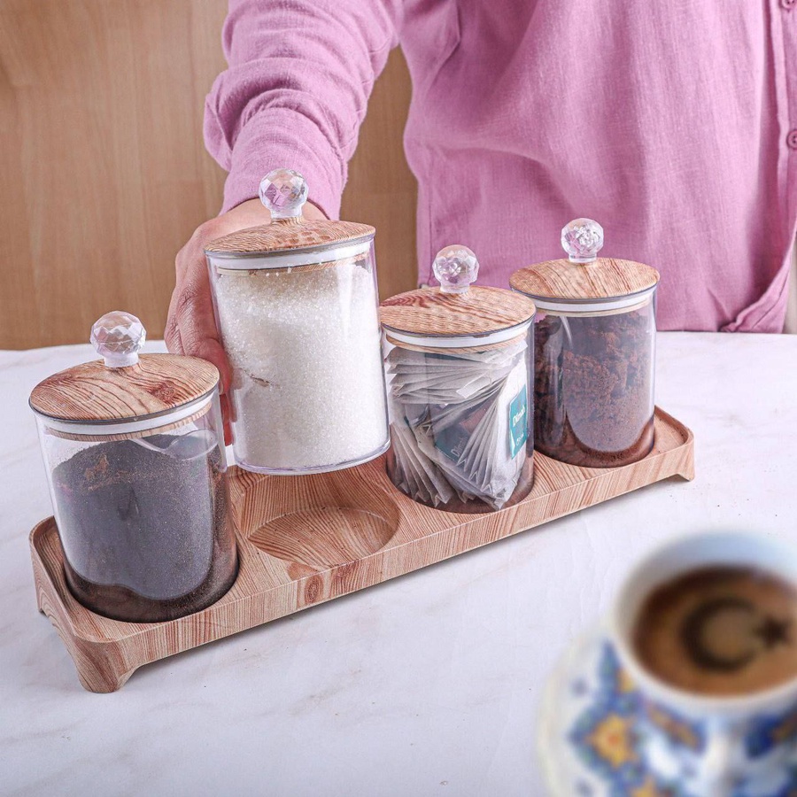 ج.مضيفي لمسة من الأناقة والتنظيم لمطبخك مع طقم السكريات كوين المكون من 4 قطع مع قاعدة عصرية. يتميز التصميم بعلب شفافة تسهل رؤية المحتويات، مع أغطية أنيقة بشكل خشبي تضيف طابع ديكوري مميز. الأغطية مزودة بإطار سيليكون محكم الغلق للحفاظ على الأعشاب والتوابل طازجة لفترة أطول، مع تقليل الفوضى داخل المطبخ. الطقم عملي ومتين، مناسب للاستخدام اليومي ويوفر سهولة الوصول لكل المكونات.