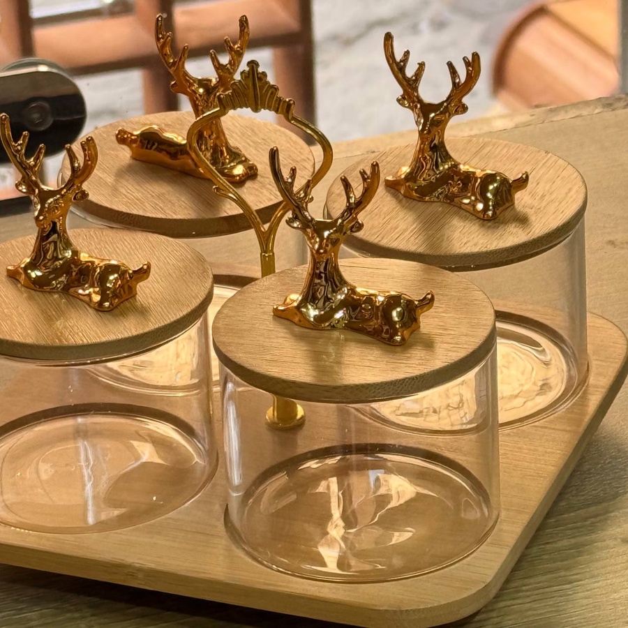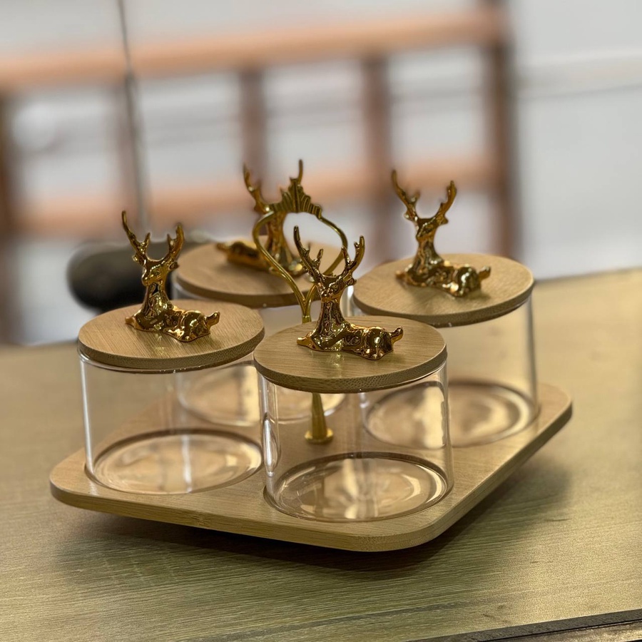 ج.مضيفي لمسة أناقة وتنظيم لمطبخك مع طقم توابل غزالة الزجاجي. الطقم مكون من 4 برطمانات مع قاعدة دوارة 360 درجة لسهولة الوصول لكل التوابل بسرعة وسهولة.
