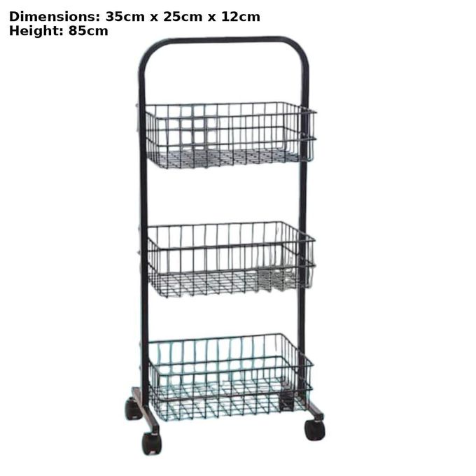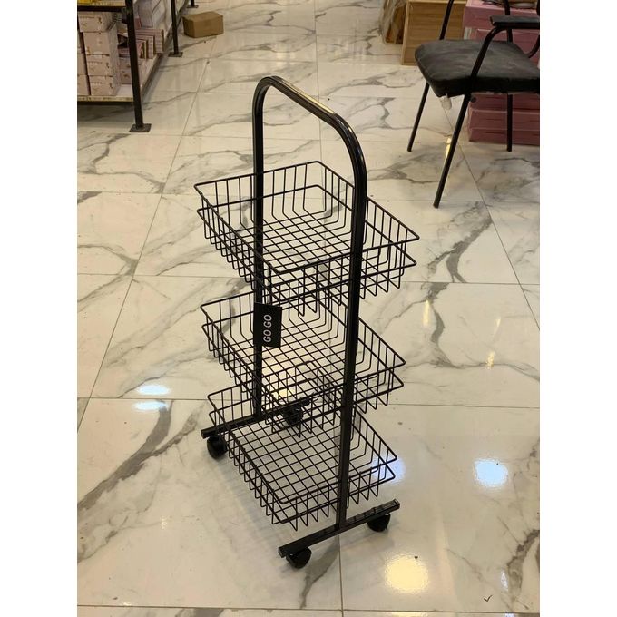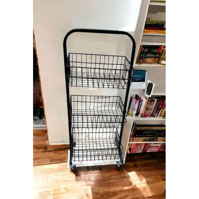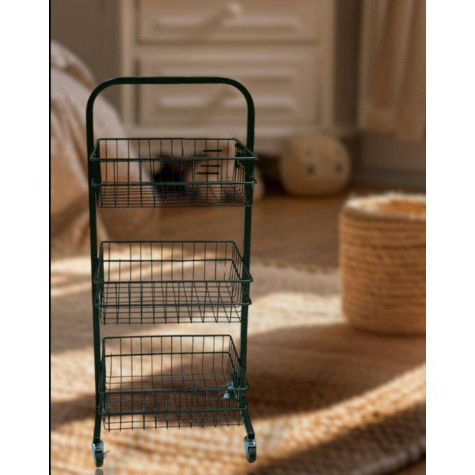 ج.مسلة سلكية معدنية متينة مزودة بعجلات. سلة متعددة الاستخدامات وعملية مصممة لتوفير الراحة. تحتوي السلة على ثلاثة أرفف معدنية واسعة، توفر مساحة تخزين كبيرة لمختلف الأغراض. الأرفف مصنوعة من شبكة معدنية متينة تسمح بمرور الهواء، مما يجعلها مثالية لتخزين المواد التي تحتاج إلى تهوية، مثل الفواكه والخضراوات.